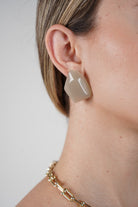 The Evale Crystal Earrings feature a faceted geometric silhouette in a soft, neutral-toned resin that mimics the look of polished stone. Lightweight yet bold, they add an elegant touch to both casual and dressy outfits. Perfect for minimalists who want a little edge, these studs complement everything from linen tops to evening dresses.