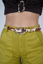 Close-up of a cow print belt with gold buckle styled on green shorts and black top.