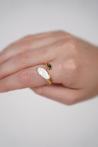 Shop the Sorea Ring at Carema Boutique. Elegant gold-tone open ring with a sleek white oval stone. Minimalist design for everyday sophistication.