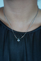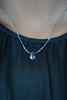 Close-up of silver chain necklace with a teardrop pendant on model wearing a black top.