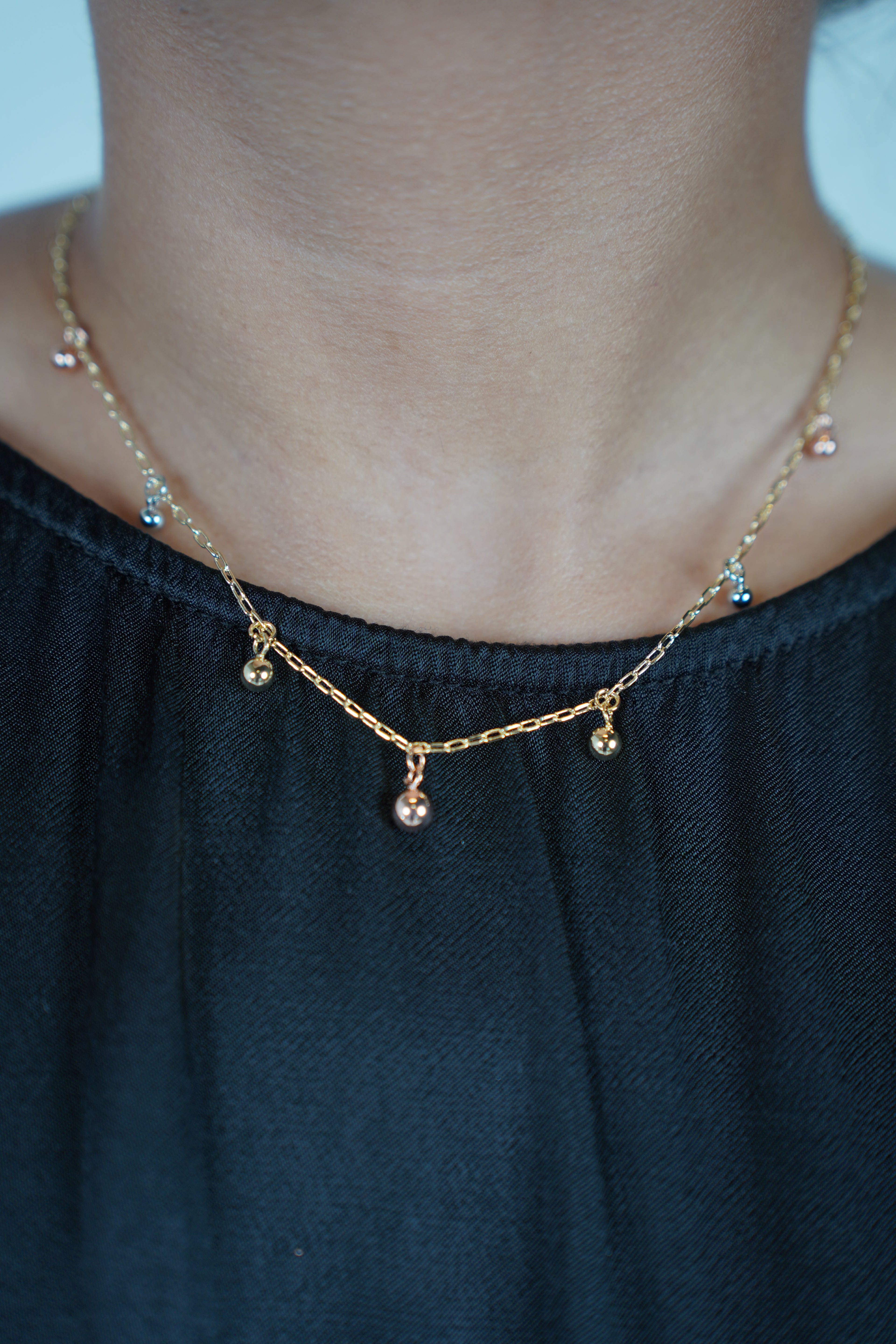 The Yulyn Pebble Necklace adds charm and shine to your everyday looks. Featuring a fine gold chain with dainty round pebble charms in mixed metallic tones, this piece is both lightweight and eye-catching. Whether you're dressing up a basic tee or layering it with other necklaces, the Yulyn brings a soft sparkle and feminine flair to any outfit.