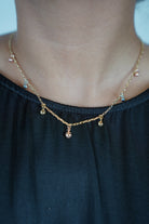 Necklace shown on model with minimal styling for a close-up look at length and charm size.