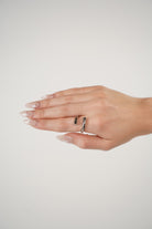 Model wears the Vilo Asymmetrical Ring on her middle finger, styled with almond-shaped nude nails and white star details. Ring is shown in polished silver.