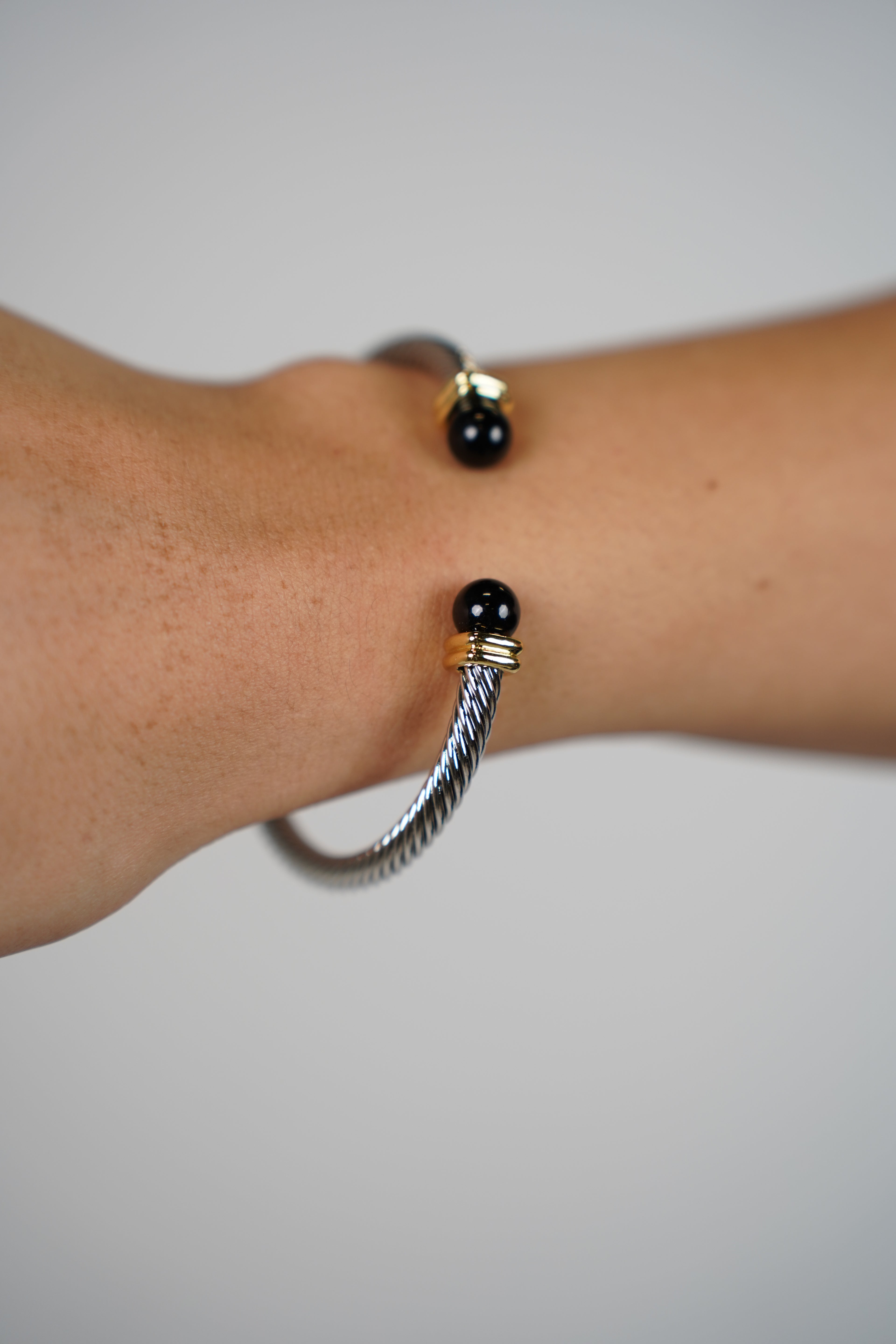 Silver cable bracelet with black bead ends and gold detailing worn on wrist
