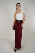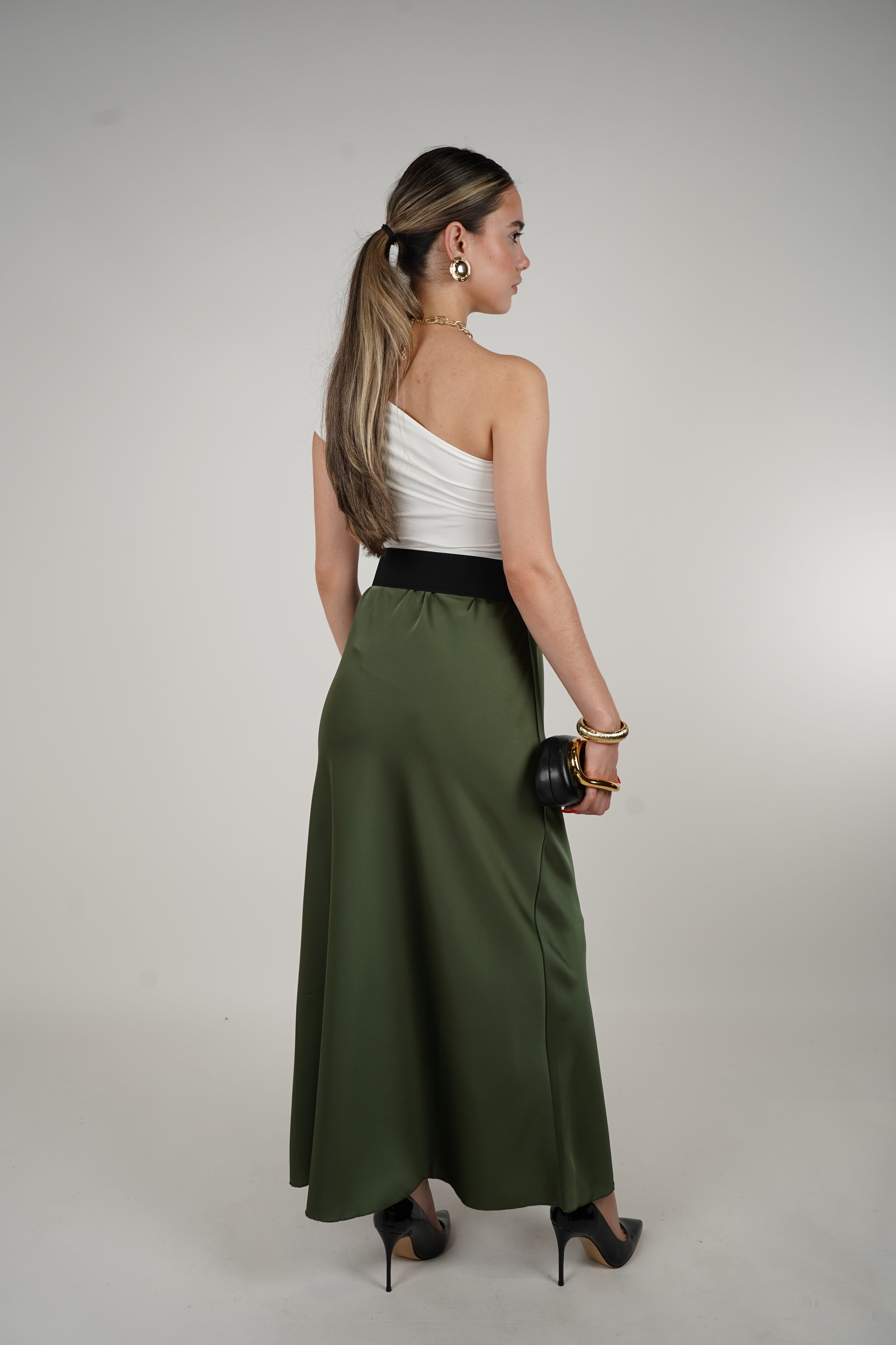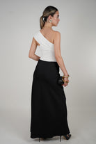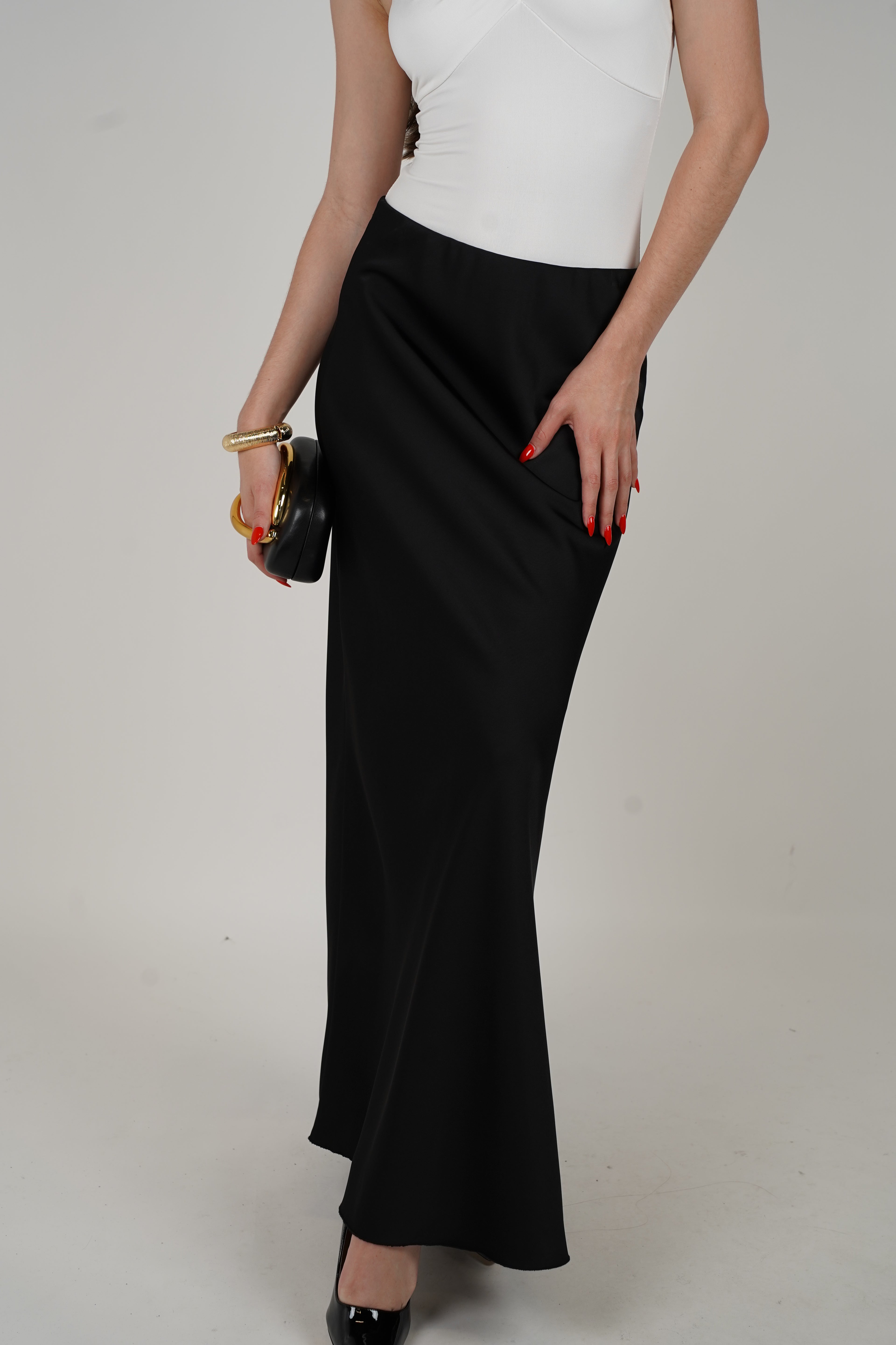 Model wearing a high-waisted maxi skirt with smooth drape, styled with an off-shoulder top and black accessories