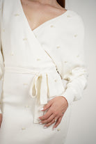 The Alicia Sweater Dress blends sophistication and comfort in one stunning piece. This ivory-toned knit dress features a wrap-style bodice with a V-neckline, long sleeves, and a self-tie waist belt for a flattering, adjustable fit. Scattered pearl embellishments add a touch of elegance and texture to the cozy knit fabric. Perfect for special occasions, holiday dinners, or a polished winter look, this dress offers warmth without compromising on chic.