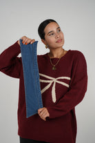 A warm, soft knit with a sweet statement. The Alondra Sweater blends comfort with charm in a rich wine hue and oversized cream bow design.
