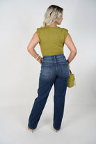 “Woman wearing medium-wash barrel-leg jeans with olive bodysuit”