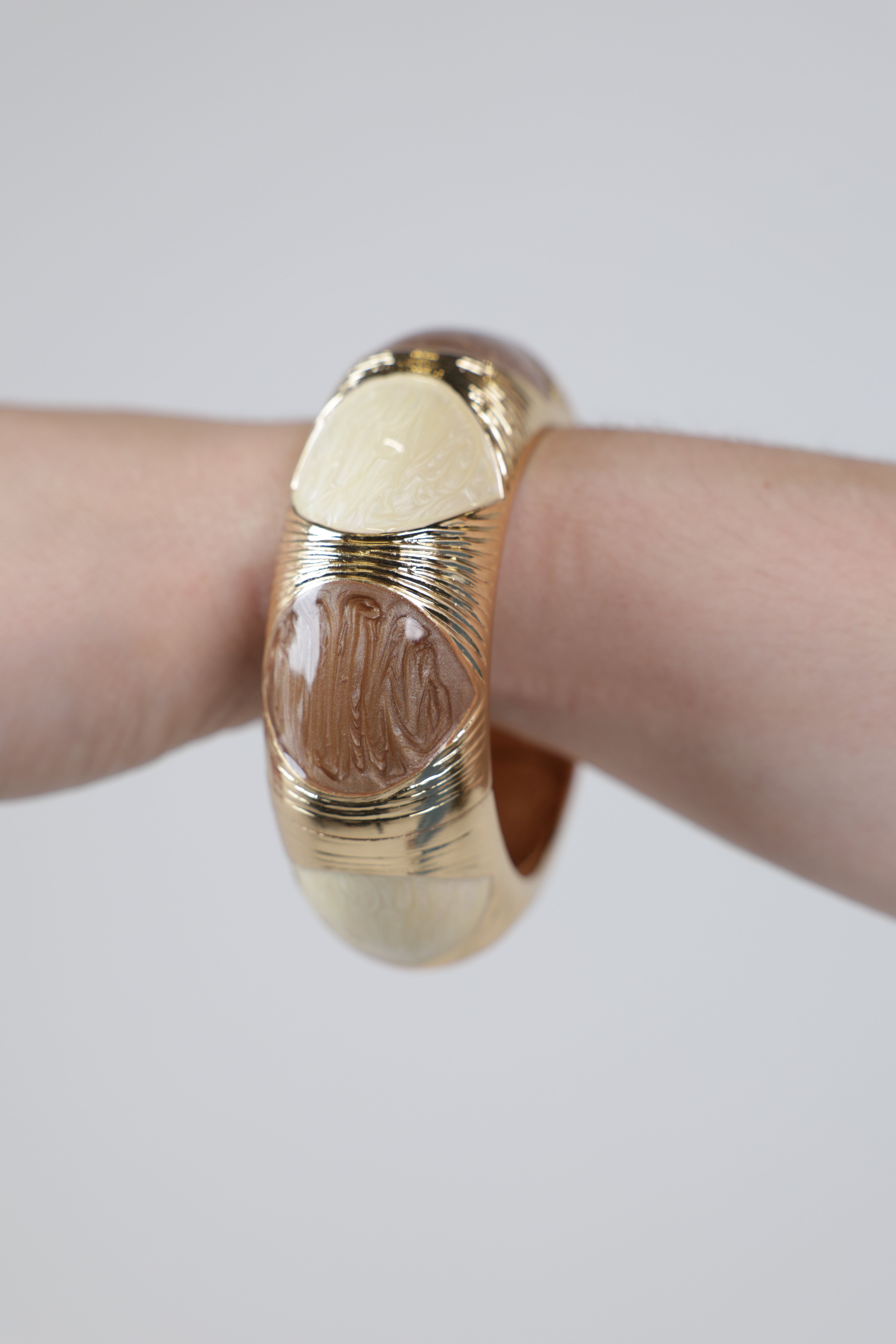 Details: Oversized enamel segments in contrasting tones, sculpted ribbed metal detailing, open cuff design for ease of wear.