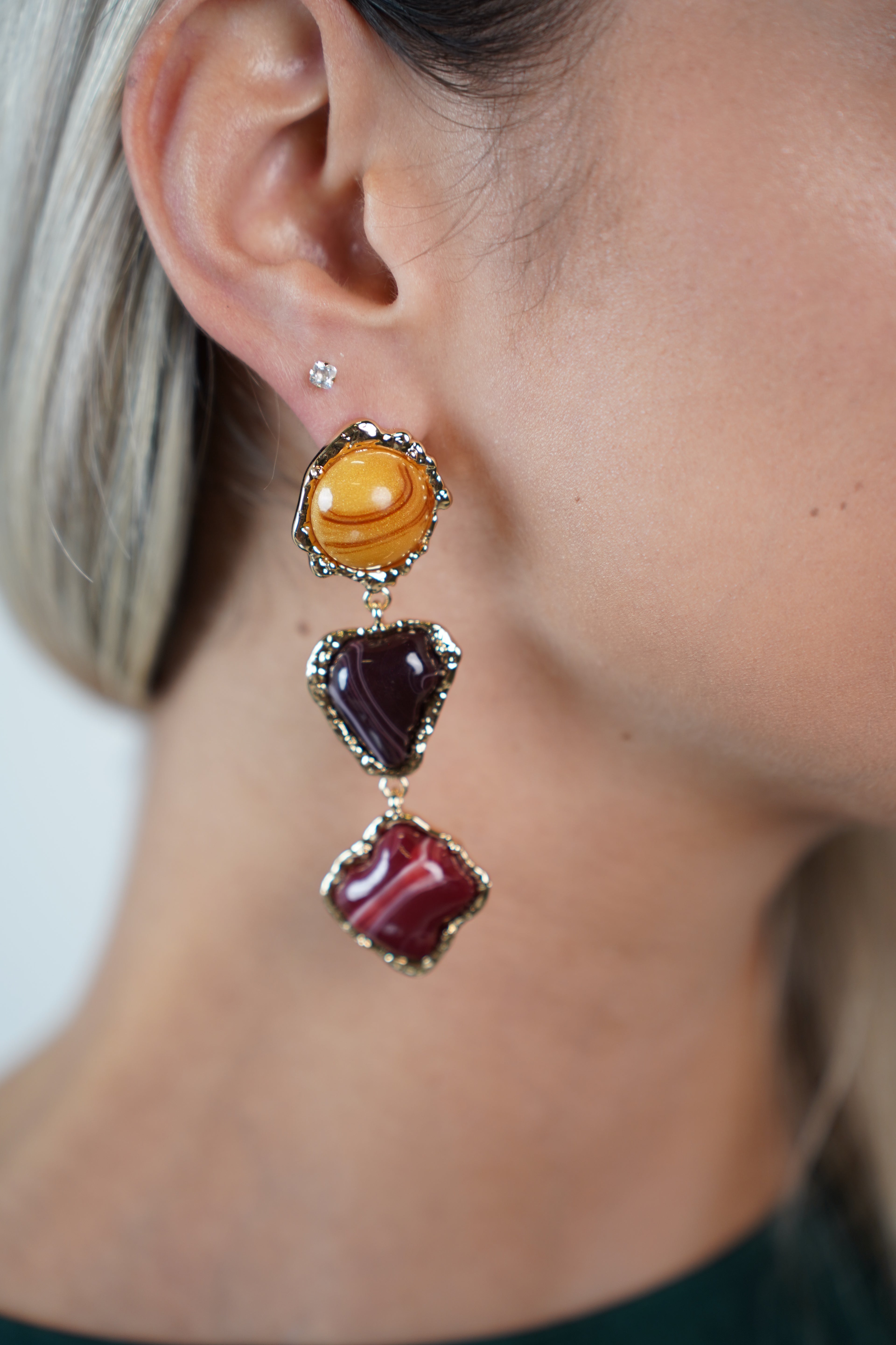 Turn every look into a masterpiece with the Amiri Dangle Earrings. These striking drop earrings feature a trio of sculpted stones in rich amber, burgundy, and red tones, each framed with delicate gold edges for an artistic finish. Designed to add instant sophistication and color, they’re the perfect balance of elegance and modern boldness.