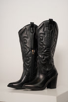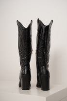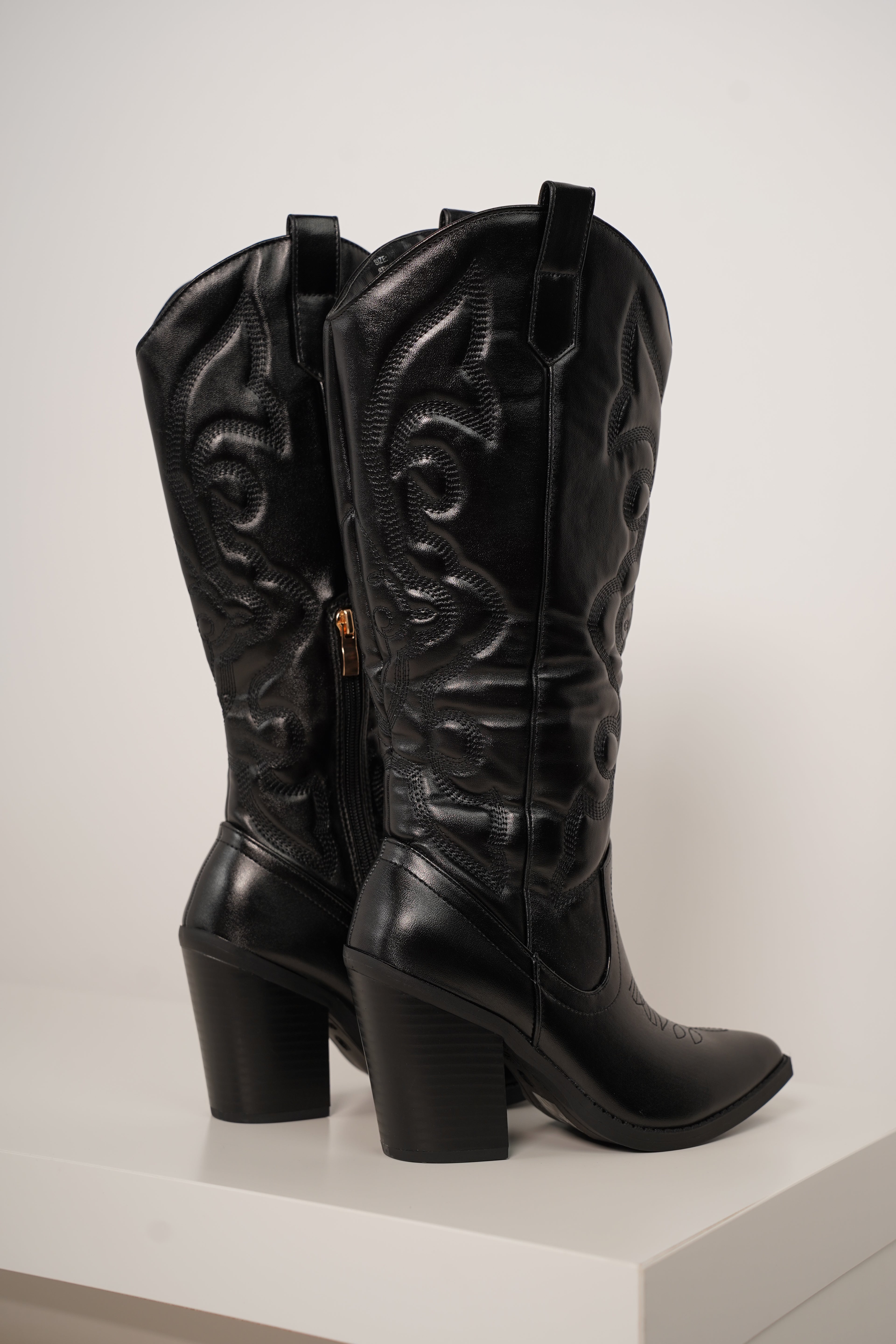 Tall black western boots with embroidered detailing, pointed toe, and block heel.