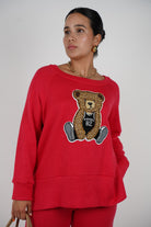 Model wearing Bear Sweater Set in red with teddy bear patch on the front, styled with white sneakers and a neutral handbag
