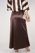 A smooth, satin-finish maxi skirt in a rich chocolate tone, offering effortless elegance and a flattering drape for both casual and elevated looks.