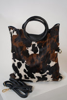Benya Bag – brown and white cow print handbag with circular black handles and detachable strap