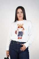 The Calvera Bear Sweater features an adorable dressed-up bear graphic on a soft, cozy pullover silhouette perfect for everyday comfort and charm.