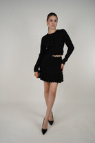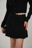 Model wearing black knit two-piece set with long sleeve button-up top and scalloped mini skirt