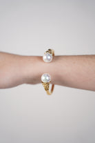 Cenya Pearl Bracelet – gold open cuff bracelet with two pearl ends on model’s wrist