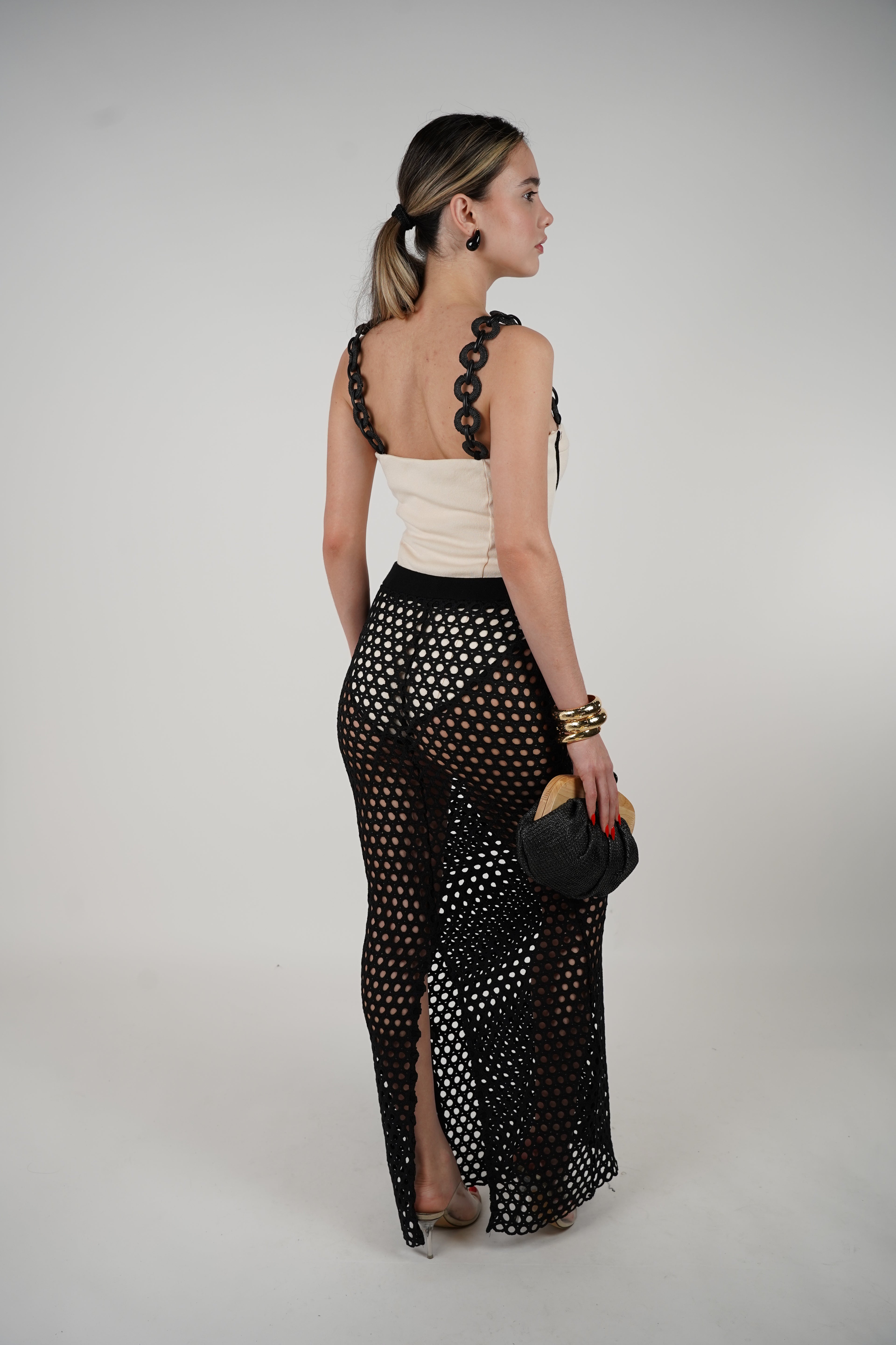 Woman wearing cream bustier top with black linked straps and black open-crochet maxi skirt, styled with a black and cream clutch.