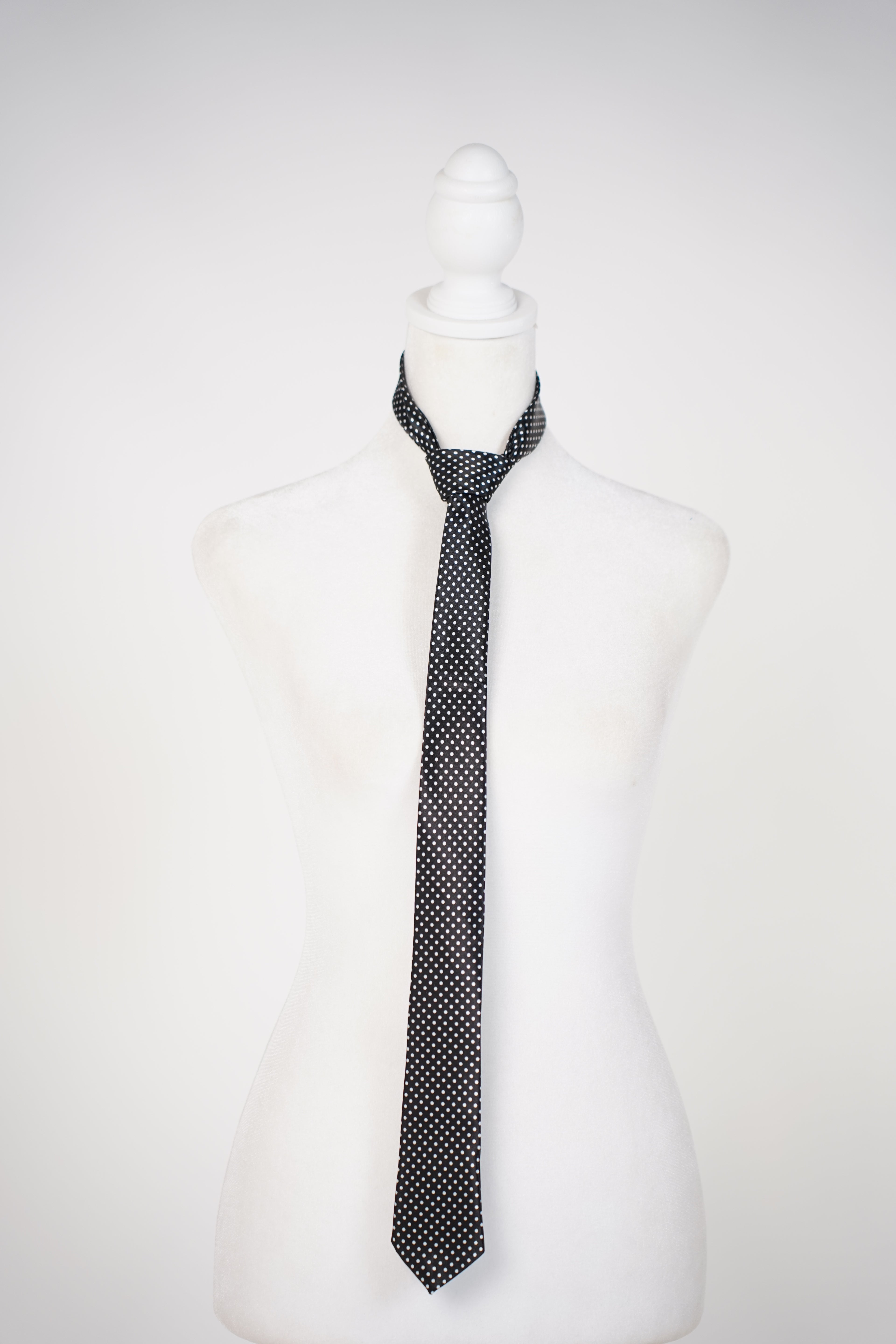 A sleek and stylish thin necktie featuring a classic polka dot print. The perfect accessory to elevate blouses, dresses, and layered looks.
