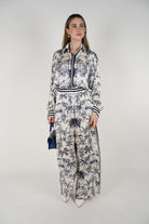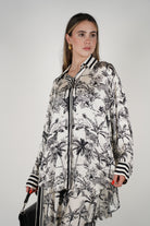 Meet the Daily Silk Pants Set – your go-to for everyday chic with a hint of tropical drama. This two-piece ensemble features a silky button-up top with a loose, relaxed silhouette and coordinating wide-leg pants. The set is adorned with a striking black-and-white jungle print featuring palm trees and wildlife, and finished with bold striped trim for a touch of contrast. Whether you're lounging in style, headed to brunch, or traveling in comfort, this set offers the perfect balance of elegance and ease.