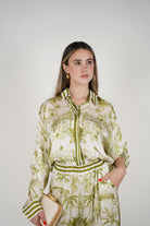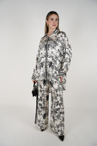 Black-and-white jungle print silk pants set with striped trim, button-up top, and relaxed wide-leg pants.