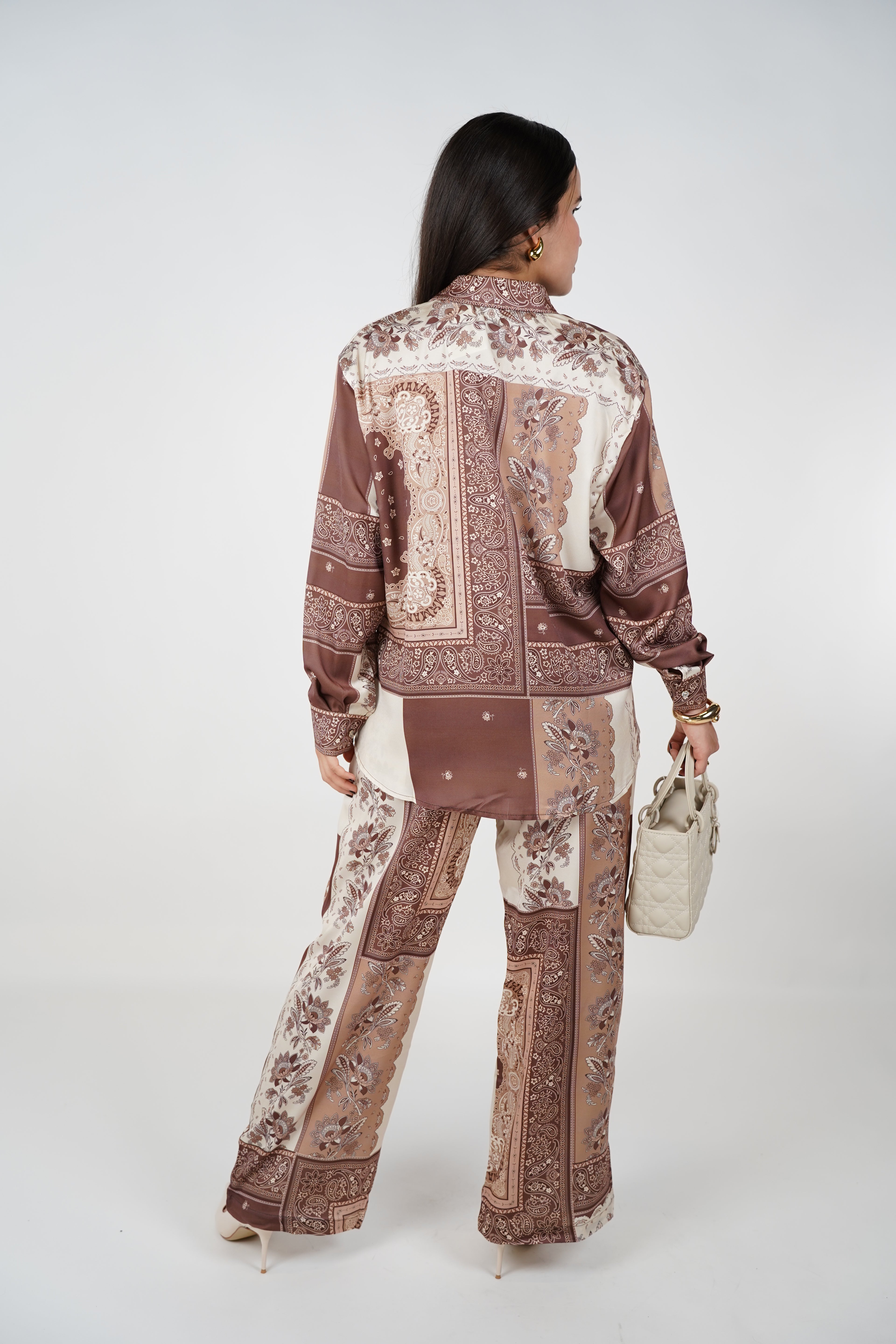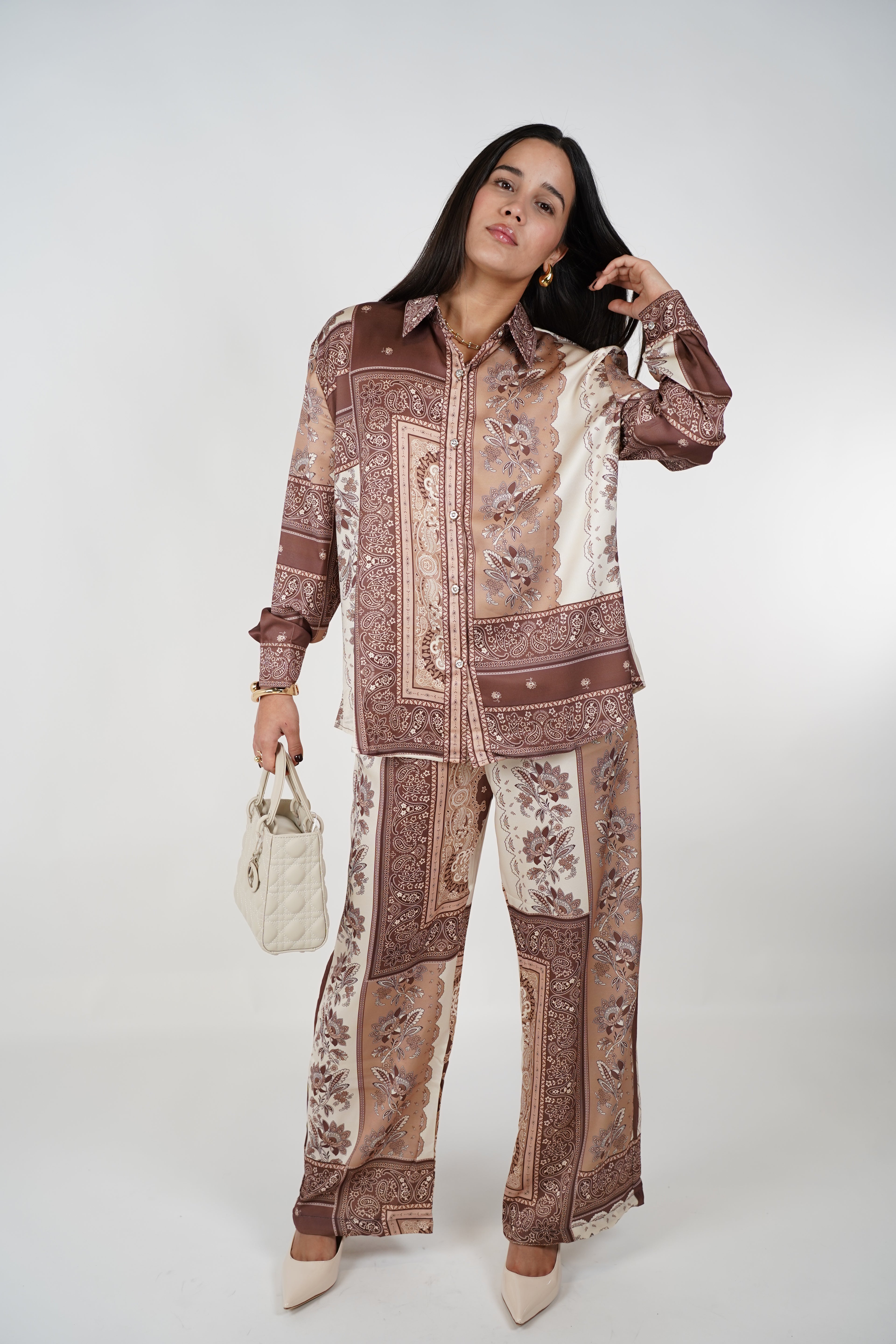 Dalia Nudes Pants Set – Satin Patchwork Lounge & Event Set | Carema Boutique