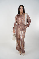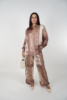 Elevate your wardrobe with the Dalia Nudes Pants Set. Silky satin patchwork print in warm neutral tones. Relaxed luxe fit for day or night. Shop Carema Boutique.