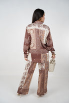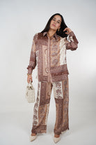 A silky-neutral dream come true. The Dalia Nudes Pants Set features a relaxed satin button-down top paired with matching wide-leg pants in a vintage-inspired nude patchwork print. Effortlessly elegant with a subtle sheen, this set offers both comfort and sophistication in one look.