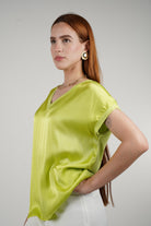 Model wearing a forest green silky V-neck top with short cuffed sleeves and flowy fit.