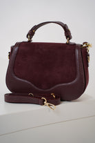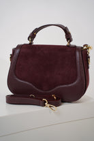 Davia Handbag – burgundy suede and leather structured bag with gold hardware