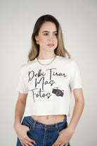 Shop the Debí Tirar Más Fotos Top – cropped white tee with “Debí tirar más fotos” Spanish quote and camera print. A playful statement piece for every look.