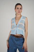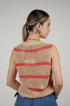 Model wearing the Demi Striped Crochet Vest in beige with navy stripes, styled over a tank and light blue pants.