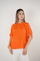 Meta Description: Add a bold pop to your wardrobe with the Emilia Flaca Top. This breezy orange blouse features pleated drop sleeves and a relaxed, silky fit. Shop Carema Boutique.