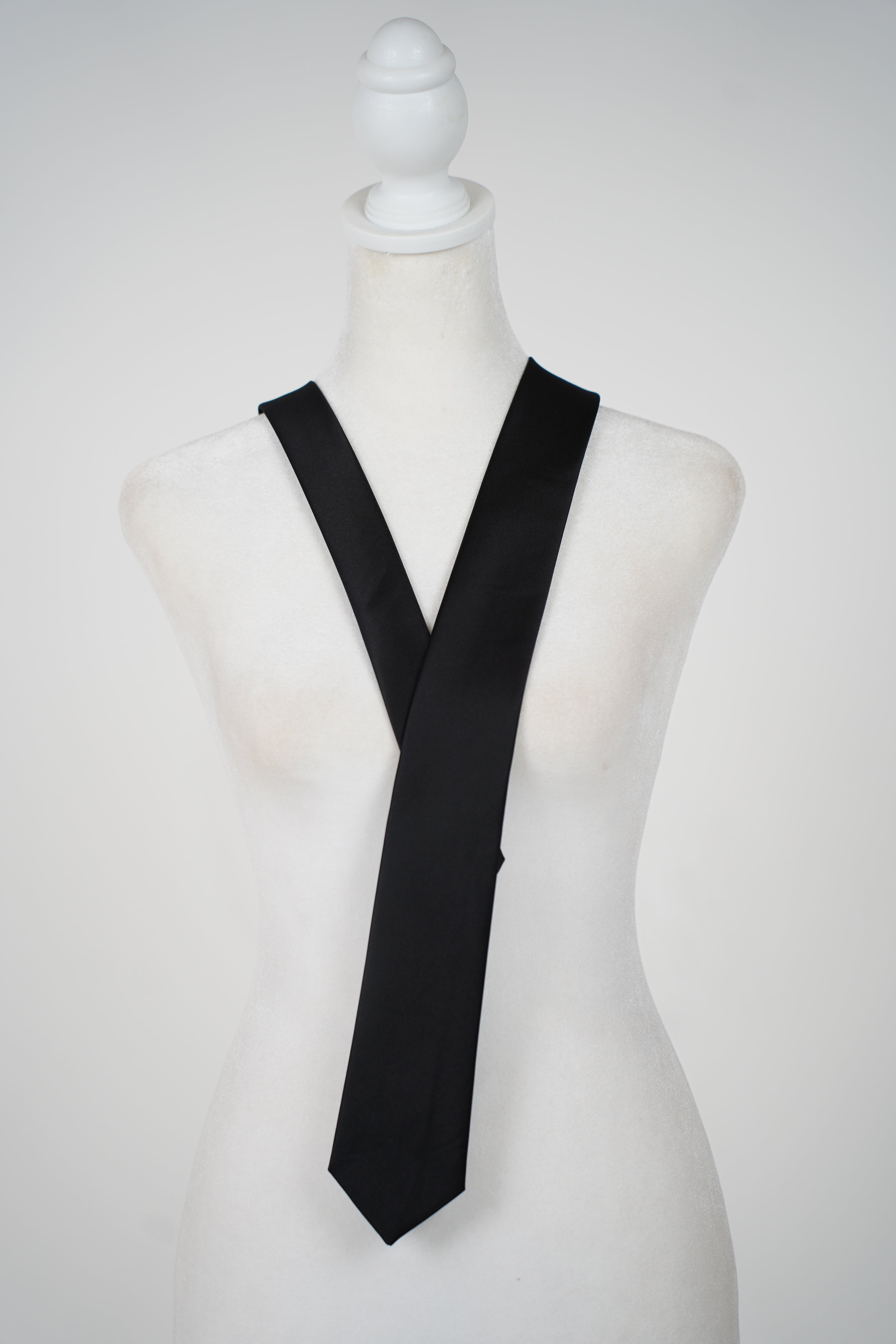 Black satin women's necktie draped on white mannequin – Flori Necktie for Women