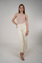 Model wearing cream wide-leg jeans with raw hem, styled with a fitted nude tank top and gold accessories.