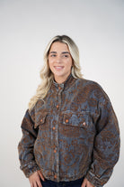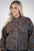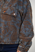 A structured denim jacket with an all-over paisley pattern that adds texture and character to everyday outfits.
