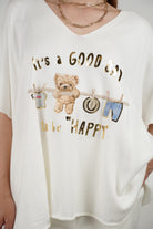 An oversized one-size tee with a playful teddy print and gold lettering—because every day is a good day to be happy.