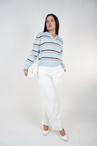 Model is 5'8", features a slim build, and is wearing the trousers with a relaxed striped blouse. Fit: comfortable wide-leg.