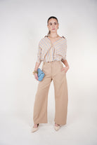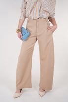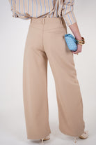 Discover the Hanyel Trousers: high-waisted, wide-leg tailored pants in a chic beige tone. Perfect for work, brunch, or everyday elegance. Shop Carema Boutique.