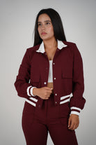 A bold two-piece set featuring a structured maroon jacket with white varsity trim and matching pants for a modern sporty edge.