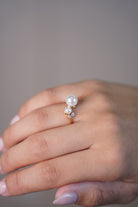 Close-up of Iria Pearl Open Ring on hand, featuring two faux pearls and small crystal accents on a gold-tone open band.