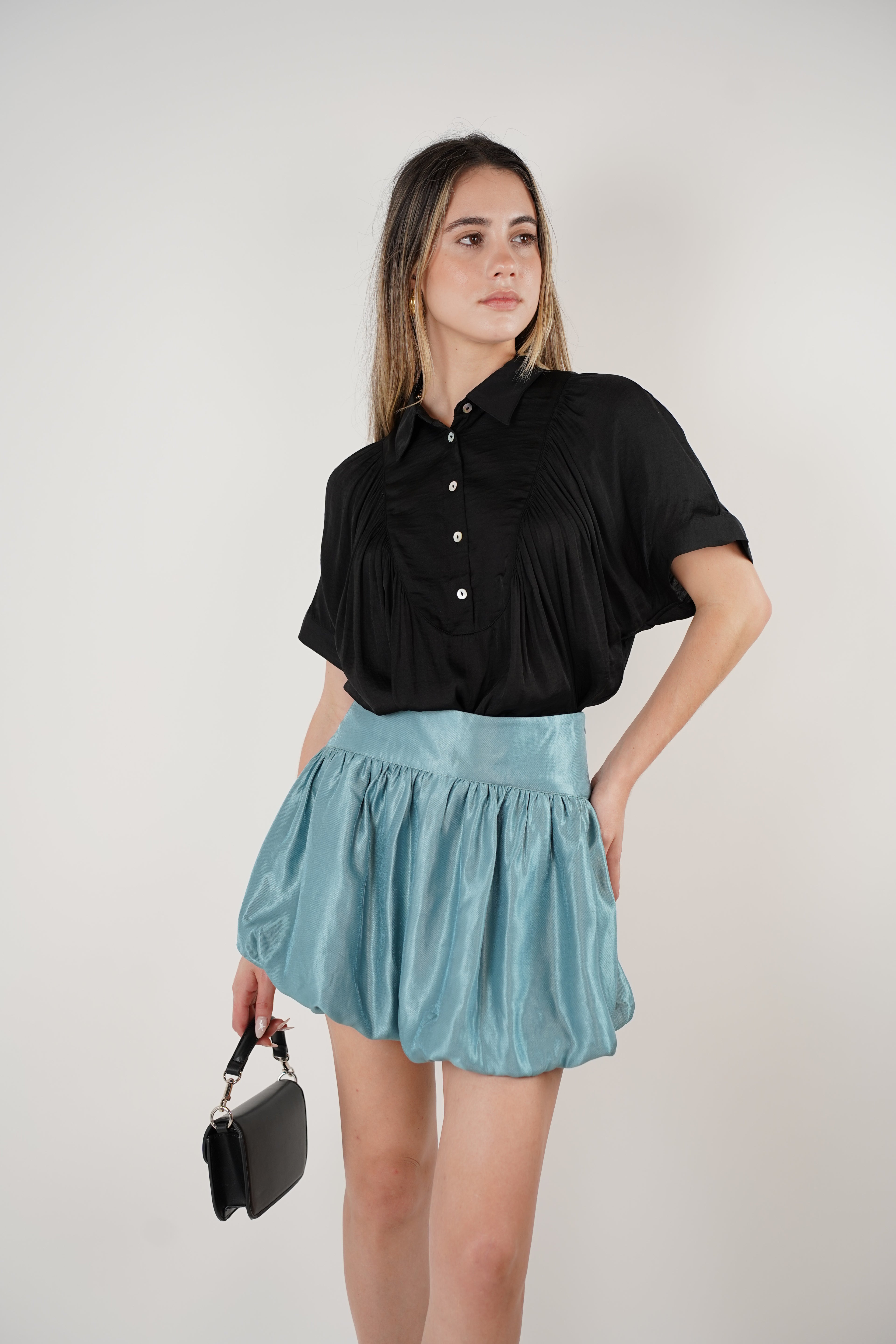 Model wearing a black pleated short sleeve blouse with collar, paired with metallic blue skirt and black handbag.