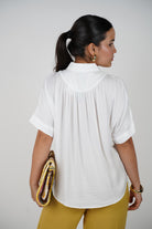 The Jeyra Flaca Top is the perfect combination of relaxed structure and refined detailing. This black short-sleeve blouse features elegant vertical pleats along the front and back, creating soft drapes that flatter every angle. The partial button placket and structured collar give it a classic twist, while the oversized shape adds a contemporary feel. Whether tucked into trousers or paired with playful skirts, Jeyra adds easy elegance to your outfit.