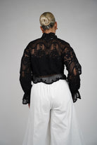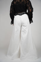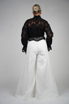 Alt text: Woman wearing crisp white wide-leg high-waisted flowy pants styled with a black lace blouse.