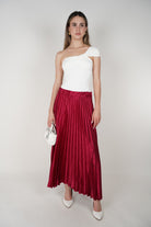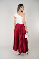 Model wearing a wine-red pleated satin midi skirt with a white one-shoulder top and white heels.