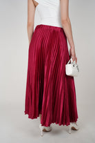 Meta Description: Turn heads with the Juanita Pleated Skirt in a luxurious wine-red satin. Flowy pleats, midi length, and a flattering fit for every occasion.