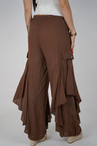 Model wearing brown Kale Ruffle Linen Pants with wide legs, side ruffles, and cargo-style pockets.