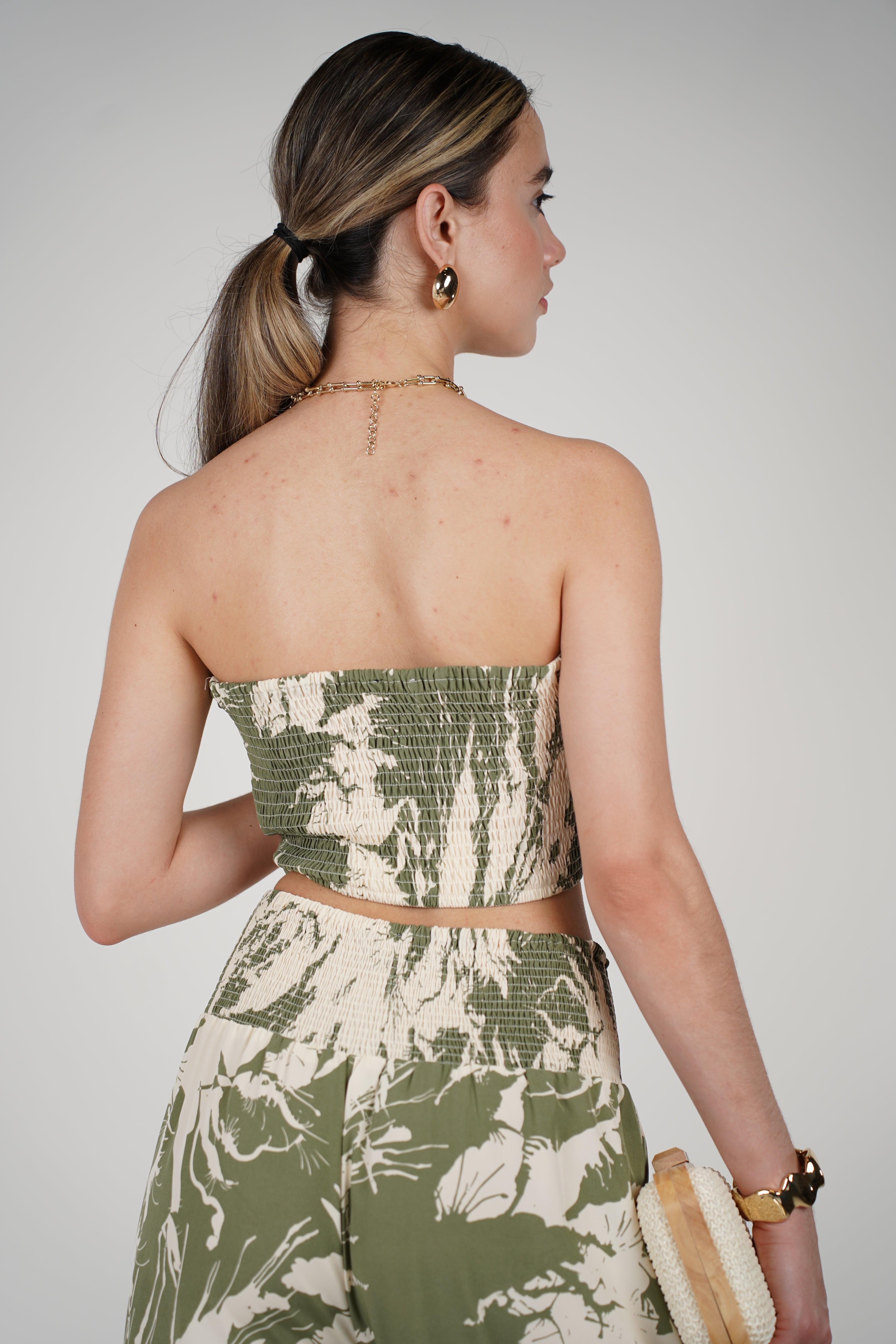 Model wearing a sage green and cream two-piece set with twist bandeau top and wide-leg pants