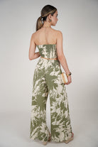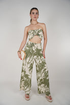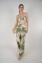 Meta Description: Shop the Kalia Two-Piece Set featuring a twist bandeau top and flowy wide-leg pants in an abstract green print. Available in S–L. Perfect for summer days.