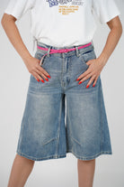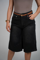 Alt text: Woman wearing washed black knee-length denim bermuda shorts with a brown belt.